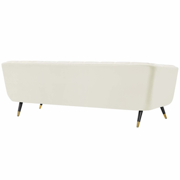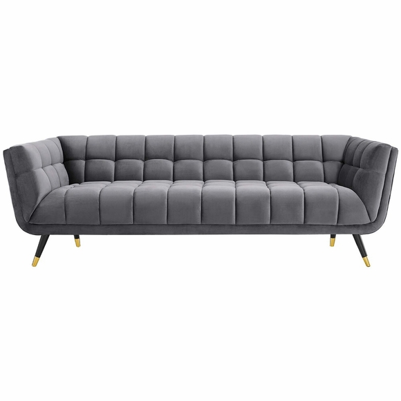 Embolden your living room decor with Adept Performance Velvet Sofa. Featuring a blend of chic, contemporary, and mid-century modern design, Adept's broad profile, deep seating, generous tufting, stain-resistant performance velvet polyester upholstery, flared armrests, and subtle metal accents imbue rich detail and chic sophistication. Enjoy the plush comfort of the Adept sofa while lounging with friends and family. Resting atop a splayed black birchwood frame with gold metal end caps, Adept is a striking addition to the home or apartment. Sofa Weight Capacity: 1322 lbs.