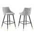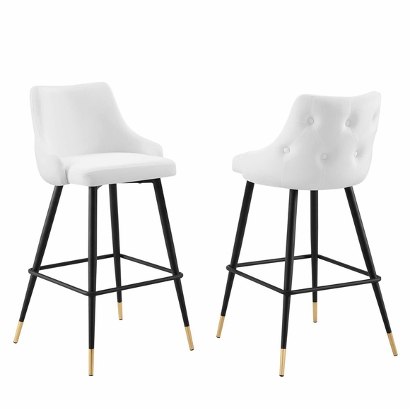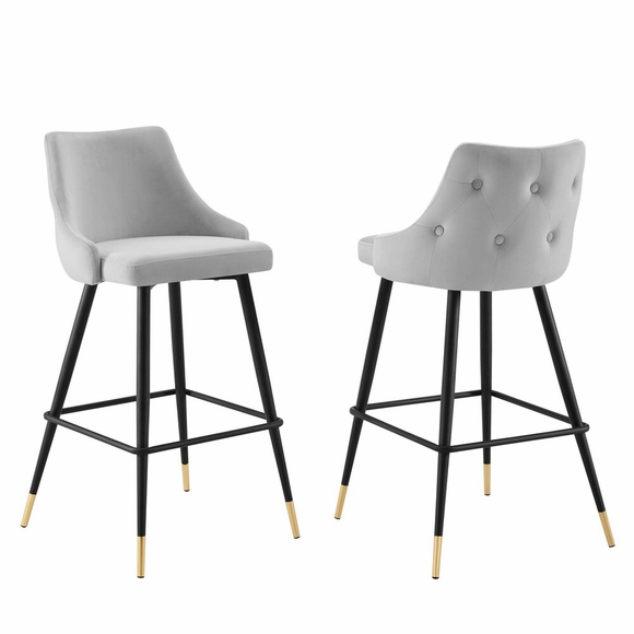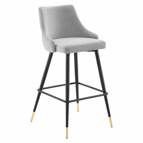 Revitalize dining room or kitchen decor with the Adorn Performance Velvet Bar Stool. Classic button tufting along the stool's exterior and graceful sweeping lines blend seamlessly into the lush comfort of this bar stool. Covered with soft stain-resistant performance velvet, this upholstered bar stool offers a comfortable place to dine with a dense foam padded seat. Sitting on four black tapered legs with gold foot sleeves, Adorn's vintage modern style and glam deco charm makes this bar stool ideally suited for a bar table or kitchen counter, or even as an accompaniment to a standing desk in the home office. This modern dining bar stool supports up to 300 lbs. and is complete with non-marking foot caps to protect your flooring. No assembly required.
