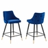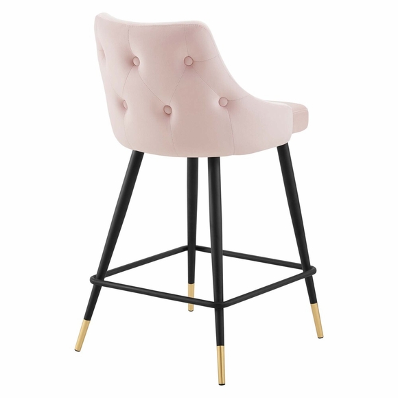 Revitalize dining room or kitchen decor with the Adorn Performance Velvet Counter Stool. Classic button tufting along the stool's exterior and graceful sweeping lines blend seamlessly into the lush comfort of this counter stool. Covered with soft stain-resistant performance velvet, this upholstered counter stool offers a comfortable place to dine with a dense foam padded seat. Sitting on four black tapered legs with gold foot sleeves, Adorn's vintage modern style and glam deco charm makes this counter stool ideally suited for a counter-height bar table or kitchen island, or even as an accompaniment to a drafting desk in the home office. This modern dining counter stool supports up to 300 lbs. and is complete with non-marking foot caps to protect your flooring. No assembly required.