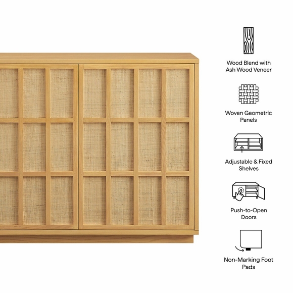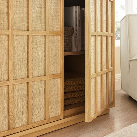 The Aiko 39 Inch Japandi Accent Cabinet is an easy, stylish way to add extra storage without taking up too much space. Crafted with a wood frame and ash wood veneer, this two-door cabinet features woven panel door fronts in a geometric grid pattern with push-to-open doors for a smooth, hardware-free look. With one adjustable shelf and one fixed shelf, it offers easy storage for serveware, glassware, books, or bar essentials. Style it as a hallway cabinet, liquor cabinet, or a living room accent hutch for a calm, pulled-together look. Its minimalist Japanese style brings a calm, clean look to dining rooms, hallways, or living spaces while adding everyday storage. Well suited to coastal and relaxed modern interiors, Aiko includes non-marking floor glides to help protect floors. Assembly required. Weight Capacity: Top : 132lb, Top Shelf : 57lb, Bottom Shelf : 57lb