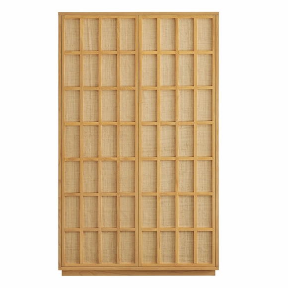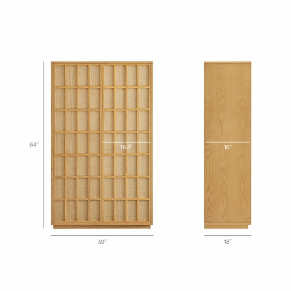 The Aiko 64 Inch Japandi Storage Cabinet is an easy way to add storage while giving the room a stylish focal point. Crafted with a wood frame and ash wood veneer, this tall storage cabinet features woven panel door fronts in a geometric grid pattern with push-to-open doors for a smooth, hardware-free look. With four interior shelves, including one adjustable, Aiko's perfect for storing dishes, glassware, serving pieces, linens, or pantry staples. Its minimalist Japanese style brings a calm, clean look to dining rooms, hallways, or living spaces while adding everyday storage. Includes non-marking floor glides to help protect floors. Assembly required. Weight Capacity: Top Shelf, Middle Shelves: 57lbs.