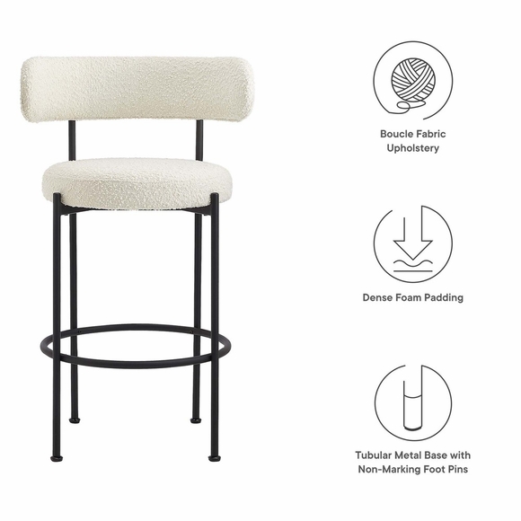 Experience luxury and modern sophistication with the Albie Boucle Dining Bar Stools - Set of 2. Upholstered in nubby textured boucle fabric, this bar-height stool set exhibits a chic silhouette with its rounded seat and curved backrest, enhancing your dining or kitchen area's aesthetic. Resting on adjustable non-marking foot pins to provide stability and protect your flooring, the bases of these bar stools are crafted from sleek tubular metal that's the perfect complement to the charming upholstery. The dense padded foam seat cushions and backrests offer a premium seating experience during everyday mealtime or entertaining. Minimal assembly is required with easy to follow instructions. Weight Capacity: 330 lbs.