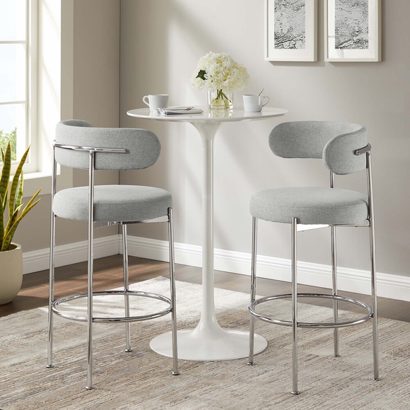 Experience luxury and modern sophistication with the Albie Fabric Dining Bar Stools - Set of 2. Upholstered in high quality fabric, this bar-height stool set exhibits a chic silhouette with its rounded seat and curved backrest, enhancing your dining or kitchen area's aesthetic. Resting on adjustable foot pins to provide stability and protect your flooring, the bases of these bar stools are crafted from sleek tubular metal that's the perfect complement to the luxe upholstery. The dense padded foam seat cushions and backrests offer a premium seating experience during everyday mealtime or entertaining. Minimal assembly is required with easy to follow instructions. Weight Capacity: 330 lbs.
