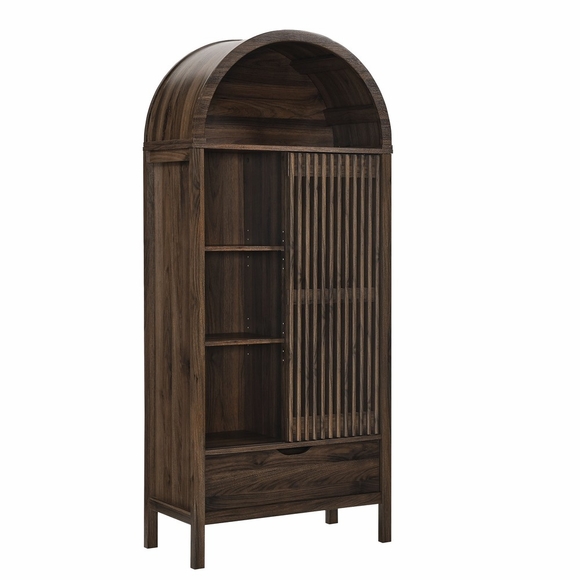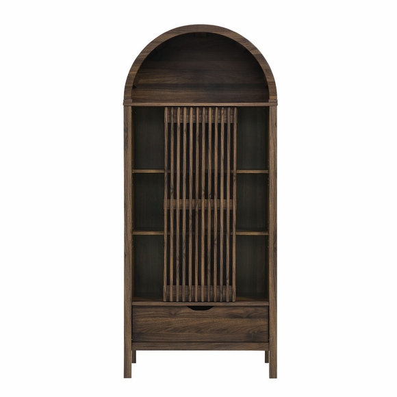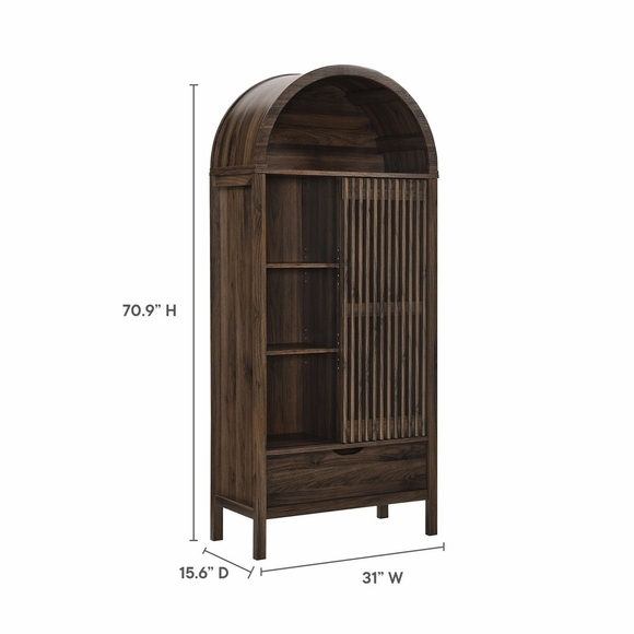 The Amara 79 Inch Large Storage Display Cabinet combines timeless style with practical organization, making it a versatile accent cabinet for the modern home. Three tempered glass doors with brass knobs open to nine shelf areas for displaying dishes, decor, or books, while three drawers and three lower cabinets with shelving provide convenient additional storage for everyday items. Crafted from a durable engineered wood blend with an attractive wood grain laminate interior, this tall cabinet also serves beautifully as a pantry cabinet, dining room buffet, or office credenza. With non-marking foot pins to protect floors, Amara is a modern storage cabinet that fits seamlessly into dining rooms, kitchens, living rooms, or workspaces. Assembly required. Weight Capacity: Top: 165lbs; Shelves: 198lbs each; Drawer: 66lbs; Lower Storage area; 264lbs each.