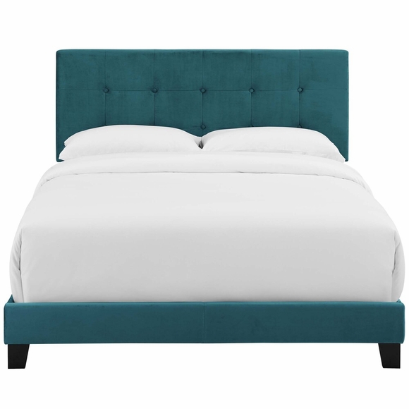 Inspire sweet dreams with a cozy Amira Performance Velvet Queen Platform Bed. Designed with chic elegance and contemporary style, Amira comes with a stain-resistant performance velvet fabric upholstered base, timeless button-tufted headboard, and wood bed frame and legs, with non-marking foot caps. Complete with a reinforced center beam for maximum stability, Amira Queen Platform Bed accommodates memory foam, spring, latex, and hybrid mattresses. A sleek and sophisticated centerpiece to the master bedroom or guest suite, this modern bed effortlessly transforms your bedroom decor with its luxe look. Box spring required (not included). Bed Weight Capacity: 800 lbs.