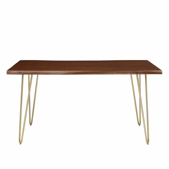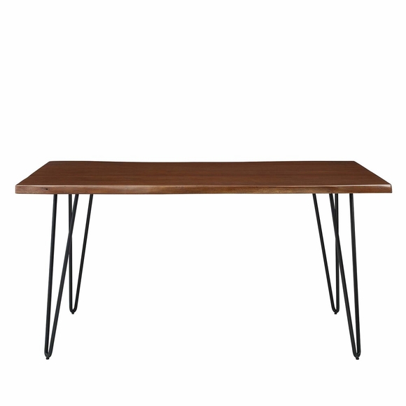 Sit amidst organic intrigue and retro style with the Ardor Rectangular Live Edge Dining Table. Featuring a one-of-a-kind raw edge tabletop crafted with a solid piece of acacia wood, this dining table is brimming with natural beauty. Comfortably accommodating six dining chairs, this 60" table rests on four powder-coated metal hairpin legs. This versatile dining table is ideal for everyday dining and entertaining and can also serve as a functional office desk. Due to the natural characteristics of the wood, each live edge table is unique. Includes non-marking foot pins to protect flooring. Assembly required.