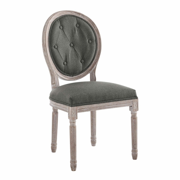 Revel in the whispered opulence of the Arise Dining Side Chair. Featuring a fluted wood frame, button tufted diamond trim, elegant welting, dense foam padding, an upholstered fabric seat, this oval back dining or accent chair elegantly blends old world charm with modern intrigue. Designed with a vintage French look and an undeniable appeal, Arise supports up to 331 pounds and comes with foot pads to preserve flooring. Comes fully assembled.
