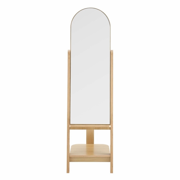 Brighten up any room with the Ascend Standing Mirror. Featuring a curved glass mirror with an arched shape, this easel mirror is crafted from a combination of mindi wood, MDF, and particleboard with a beautiful wood grain laminate. It's versatile design boasts a shallow shelf under the mirror and two open shelves for either storage or display, while three clothing pegs offer functional hanging space. Appraise outfit selections on your way out the door with this stylish addition to a bedroom, living room, entryway, or other living space. Easy to follow assembly instructions included.