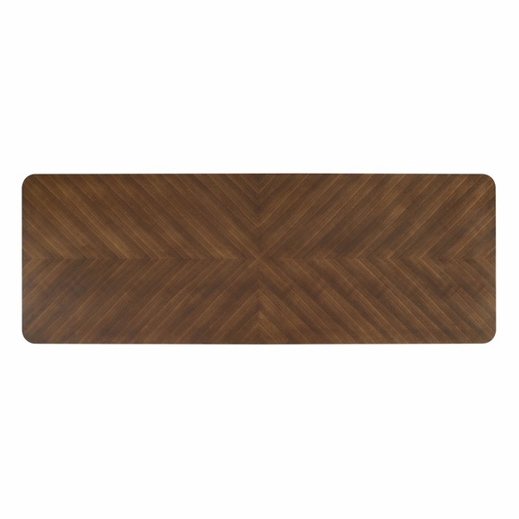 The Ashlan 110" Rectangle Dining Table brings modern edge and timeless warmth to shared spaces. Designed with a chevron wood blend tabletop, this large dining table comfortably seats ten while anchoring any room with its elongated silhouette. The base features cylindrical rubberwood legs joined by wide, angular stretchers that form an X-shaped support-adding industrial character and structural stability. Perfect as a large kitchen dining room table, Ashlan also works as a work conference table or home office table, easily transitioning between dining and professional settings. Leveling feet and non-marking caps keep the wood dining table steady and floor-friendly. Assembly required. Weight Capacity: 400 lbs.