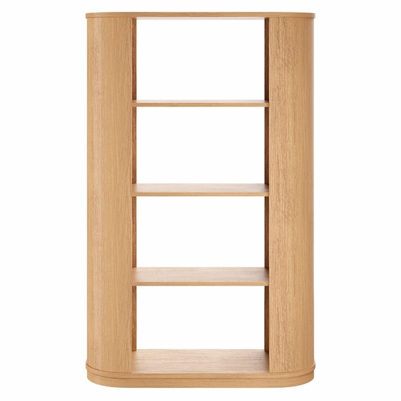 Soft lines and a distinctive silhouette make the Aspect Curved Bookcase a standout piece for relaxed, design-forward spaces. Crafted from a wood blend with oak veneer, this 74 inch bookshelf features a distinctive rounded-edge frame and four spacious tiers for open display. Aspect's clean-lined profile offers ample room for books, decor, and collectibles while maintaining a minimal footprint. A modern interpretation of a library bookcase, this open display book shelf for living room settings has the look of a vintage piece, built for modern life. Non-marking foot pins provide floor protection, making it a thoughtful addition to the living space, dining area or home office.