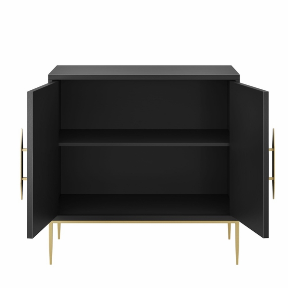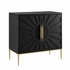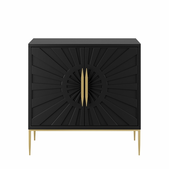 The Awaken 35" Accent Cabinet brings intricate modernity to your space. Featuring clean lines in a radial formation, this small storage cabinet is crafted from wood veneer and rests on a sleek gold base with non-marking foot pads to protect your floors. The doors showcase a striking sunburst design, with radiating lines that form a dynamic and visually captivating pattern. Accentuated by gold hardware, this piece offers an adjustable shelf perfect for storing linens, home decor, silverware, barware, and more. Ideal for the hallway, entryway, or living room, this two-door cabinet combines functionality with style. Assembly required. Weight capacity: 200 lbs.