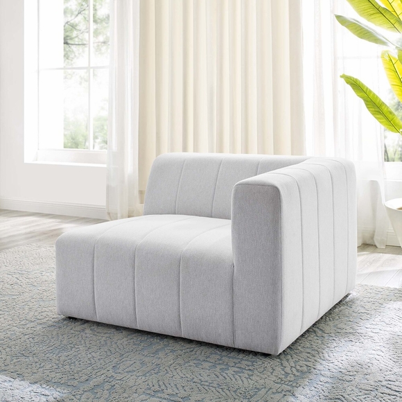 Indulge in comfort and relaxation by creating a custom living room and lounge area with the Bartlett Upholstered Fabric Right-Arm Chair. Featuring subtle channel tufting, rounded corners, and soft polyester fabric upholstery, this sectional sofa right-arm chair brings retro modern style and contemporary allure to your living space. Dense foam padding and a pocket coil spring system in the cushions offer a luxe seating experience with premium support and comfort. with a sturdy frame crafted from solid wood and plywood, this living room chair features modular connectors to keep each sectional sofa piece secure and non-marking foot caps to protect flooring. Chair Weight Capacity: 331 lbs.