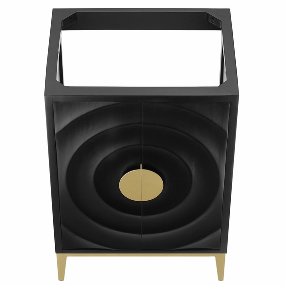Refresh your bathroom's look with the Beau Wood 24" Bathroom Vanity, combining modern design with a classic sense of style. Made from solid wood, it offers both durability and a rich texture that complements any decor. Featuring an eye-catching design with concentric circles that draw the eye inward to a chic, brass-like metal cabinet pulls, this single bathroom vanity pairs classic elegance with contemporary flair. Standing on tapered legs that match the pulls, the Beau wood bathroom vanity creates a cohesive and sophisticated look. Inside, an adjustable shelf cleverly uses the available space while accommodating plumbing with its thoughtful cut-out design. Ideal for those who prefer to personalize their space, this cabinet vanity comes without a basin, allowing you to choose the perfect top. Whether it's for a compact or more spacious bathroom, Beau blends aesthetic charm with everyday usability making it a smart yet fashionable choice for modern living. Assembly required. Sink basin not included.