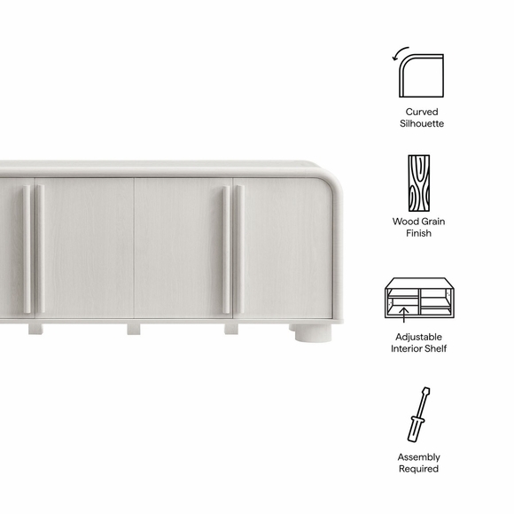 Blending contemporary design with functional elegance, the Bellamy Sideboard Cabinet creates a refined storage solution for dining rooms, living spaces, and entryways. Featuring a gracefully curved silhouette, this modern buffet cabinet makes a stylish statement while offering ample space for organizing dinnerware, linens, household items, or as a TV stand for wall-mounted TVs. Crafted with a beautiful laminated wood grain finish, this storage cabinet is designed with distinctive elongated handle pulls and unique rounded feet, adding a touch of modern sophistication. The soft-close doors open to reveal an adjustable shelf, allowing for customizable storage options. Thoughtfully designed with non-marking floor glides for stability and floor protection, this versatile rounded cabinet is perfect for any space. Assembly required.