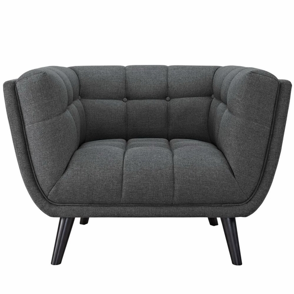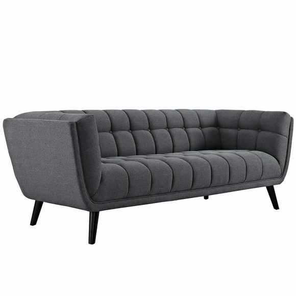 Generously update your decor with Bestow. Uniquely designed with a striking broad profile, Bestow comes finely upholstered in polyester fabric with dense foam padding and elegant button tufting. Sturdily positioned on splayed and tapered black finish wood legs with non-marking foot caps, Bestow boasts a bountiful living room seating design brimming with possibilities. with ample seat depth and overscaled frame, invite all your guests to sit comfortably in this 12" high back and arm rest collection perfect for mid-century, modern farmhouse or contemporary decors.