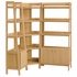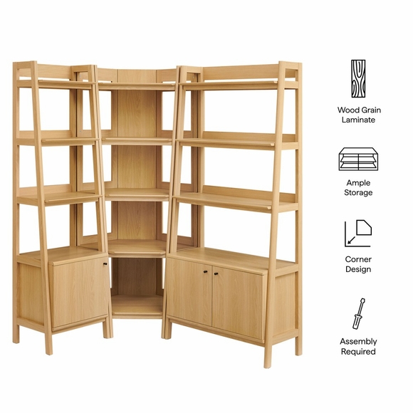 Stack your favorite reads and display decor with this wider 3-piece Bixby corner bookcase set. Designed to nest neatly into a corner, the set offers twelve total tiers, combining open shelves with lower cabinets on each side for hidden storage. Laminated wood grain and clean, open lines keep the look balanced and modern, while angled side supports and window-style panels lighten the profile and add stability. Built from a durable wood blend for long-lasting use, the Bixby wide bookcase set serves as a prominent 88 inch wide wall display. Weight Capacity: 141 lbs per shelf.