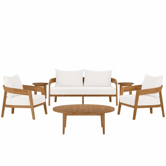 Embrace warm weather with the Brisbane Teak Wood Outdoor Patio Furniture Set. Curved lines and a clean design create contemporary charm that makes a statement on your porch, in your backyard, or poolside. Perfect for al fresco entertaining or relaxing by the pool, the Brisbane Outdoor Patio Furniture Collection is crafted with durable Premium Grade A teak wood and complete with comfortable cushions covered in machine washable sun, stain, water, and fade resistant Sunproof® fabric covers. Includes non-marking plastic foot glides. Patio Set Includes: 1 Loveseat, 2 Armchairs, 1 Coffee Table, 2 Side Tables
