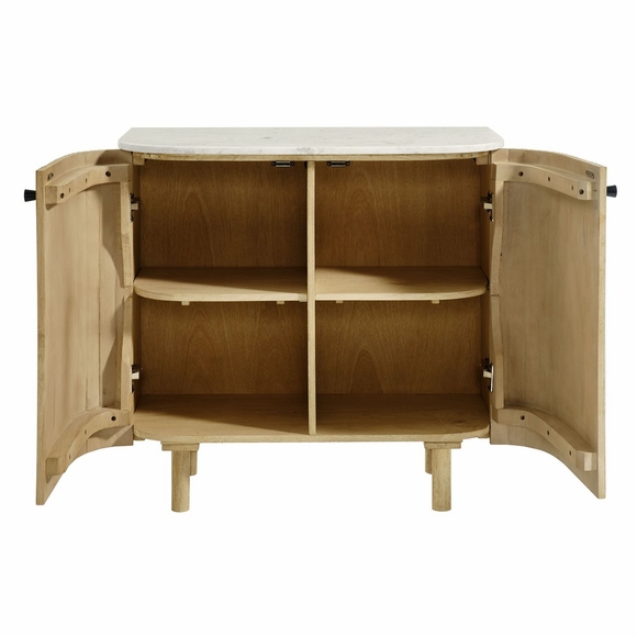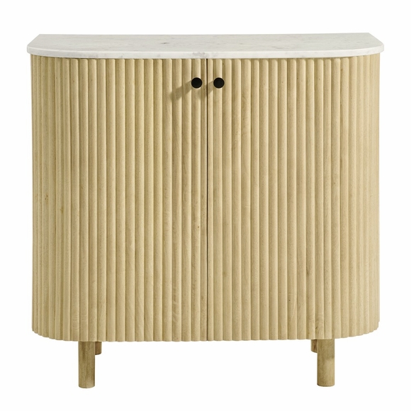 Bring sculptural elegance to your space with the Caldera Curved Accent Storage Cabinet, a modern fusion of refined materials and clean, curved form. Featuring a smooth marble top with softened edges and a body crafted from solid mango wood, this compact accent cabinet makes a bold yet versatile statement in any room. The vertical fluted detailing on the doors and sides adds texture and mid-century charm, while the rounded peg legs and minimalist black knobs create a grounded and contemporary silhouette. Two soft-close doors open to reveal a spacious interior with an adjustable shelf, ideal for organizing serveware, linens, or everyday essentials. Designed with non-marking pads to protect floors, Caldera brings timeless character and functionality to entryways, dining areas, living rooms, and beyond. Assembly required. Weight Capacity: 200 lbs.