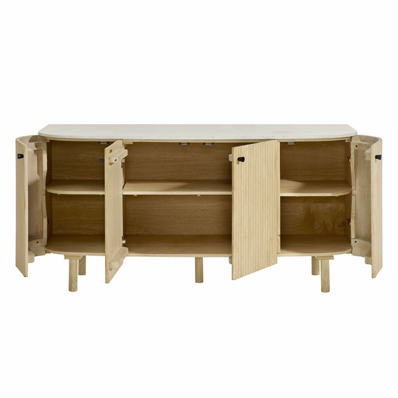 Bring sculptural elegance to your home with the Caldera Curved Sideboard, a seamless blend of natural materials and refined design. Topped with a smooth slab of genuine marble, this 60" fluted buffet cabinet is crafted from solid mango wood and shaped with soft curves that lend an organic, contemporary presence. Four soft-close doors conceal three generous storage areas, each with an adjustable shelf, making this sideboard a multifunctional solution for the entryway, dining room, hallway, office, or as a stand for wall mounted TVs. From storing serveware and linens to organizing media accessories or bar essentials, the Caldera Storage Cabinet is as functional as it is eye-catching. The vertical fluting and rounded edges offer texture and visual depth, while minimalist black hardware maintains a sleek, modern profile. Designed with non-marking floor pads to protect your surfaces, this statement accent cabinet requires straightforward assembly. Weight Capacity: 200 lbs.