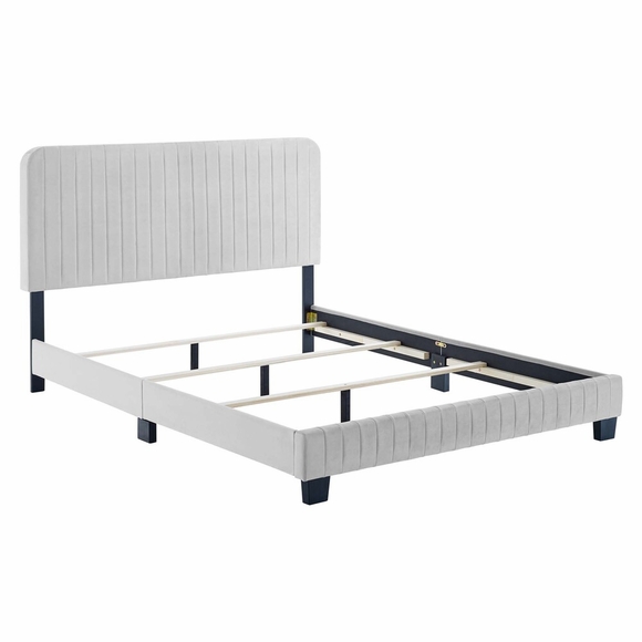Elevate your guest bedroom or kid's bedroom style with the luxe texture and glam deco elegance of the Celine Twin Bed. Adorned with channel tufted detail, the twin size headboard of this upholstered bed is padded in dense foam to offer supportive comfort while sitting up resting, relaxing, reading, or watching TV. Upholstered in stain-resistant performance velvet, this twin size bed features support legs for added durability. A sturdy mattress foundation, this twin size bed accommodates a variety of mattress styles including innerspring, memory foam, and latex with the use of a box spring. Assembly required. Weight Limit: 400 lbs.