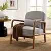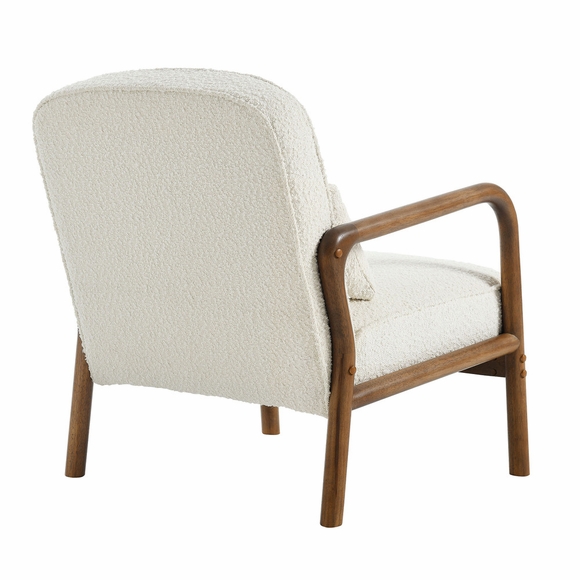 Experience the perfect blend of comfort and timeless style with the Charlie Boucle Chair, a piece of living room furniture that merges mid-century modern elegance with contemporary allure. Crafted with a solid wood frame and dense foam padding on the seat and backrest, this boucle upholstered armchair offers a luxurious seating experience that makes it an irresistible addition to any living room or cozy reading nook. The rounded armrests enhance its aesthetic appeal and also provide extra comfort, making it the perfect modern accent chair for relaxing. Complete with a matching throw pillow for added support, this boucle armchair is not just a comfy reading chair -it's a statement of style. Ideal for those seeking a mid-century modern accent chair, the Charlie Living Room Chair enriches any space with its textured boucle upholstery and curved wooden armrests. Includes felt pads to protect flooring. Assembly required. Weight Capacity: 330 lbs.