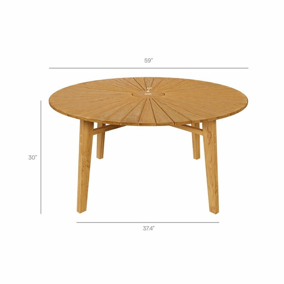 Set the scene for al fresco dining and weekend gatherings with the Cielo Outdoor Dining Table. Crafted as a teak solid wood round dining table, Cielo features a striking starburst slatted top that radiates from the center for a warm, sunburst look that feels right at home on a deck, patio, or porch. An integrated outdoor table with umbrella hole makes it simple to add shade, while the supportive cross brace beneath the tabletop helps keep the table grounded and stable for everyday use. Sized as a 59" round dining table for outdoor patio or porch dining, Cielo comfortably seats 6-8, making it an inviting outdoor entertaining table for family dinners, casual brunches, and summer hosting. Built from premium teak, this weather-resistant solid wood table brings lasting durability and natural character to your outdoor space. Assembly required. Weight Capacity: 704 lbs.