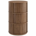 Elevate your space with the sculptural charm of the Clement 3-Door Pedestal Stand Storage Table. Designed in a sleek cylinder shape, this round end table showcases a mid-century modern silhouette with vertical slatted details and a warm wood grain laminate finish. Three sliding tambour doors offer concealed storage while adding textural depth and retro appeal. Each door can be installed to slide either left-to-right or right-to-left, allowing for customizable functionality. Whether placed in the living room, bedroom, hallway or entryway, Clement brings functional style to any room. Equipped with non-marking felt pads, this small circle pedestal table protects floors and combines useful storage with vintage modern appeal. Assembly required.