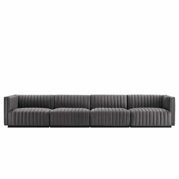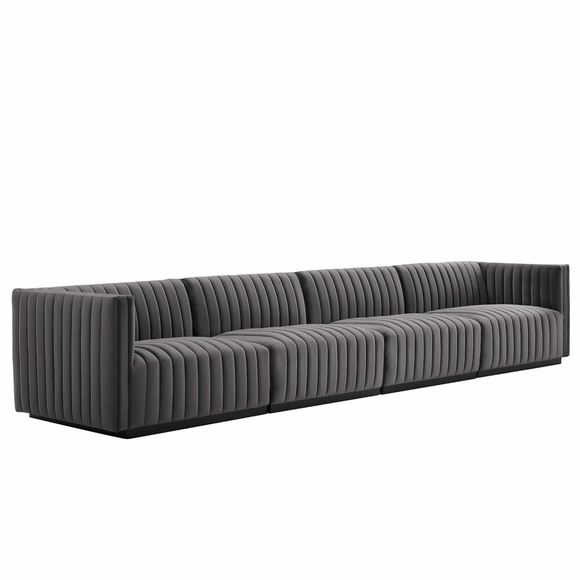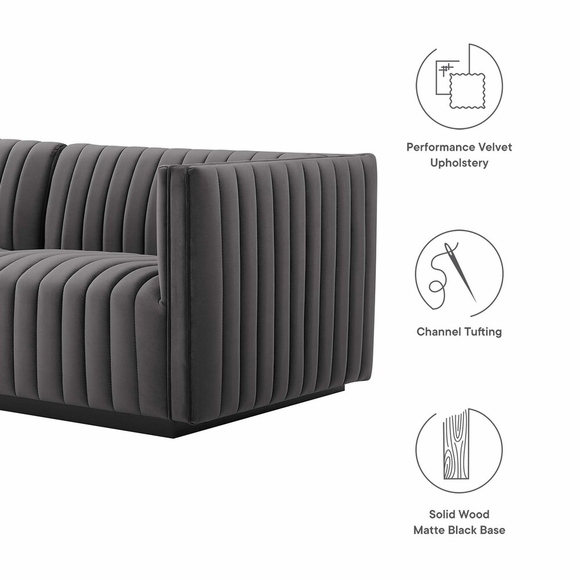 Modern appeal surrounds the Conjure Channel Tufted Performance Velvet Upholstered Sofa. Luxuriously soft, stain-resistant performance velvet upholstery covers dense foam padding and an individually wrapped spring coil system for a supportive living room sofa that will become the go-to lounge spot for family and friends. Vertical channel tufting and subtle French piping adds depth to this vintage inspired three-seater sofa that effortlessly becomes the focal point in your living room. Solidly constructed from wood and plywood, this sofa features non-marking foot caps and boasts a matte black base. Versatile and elegant, this sectional sofa is ideally suited for a variety of decor styles in your living room, lounge, or home office. Each Seat Weight Capacity: 331 lbs.