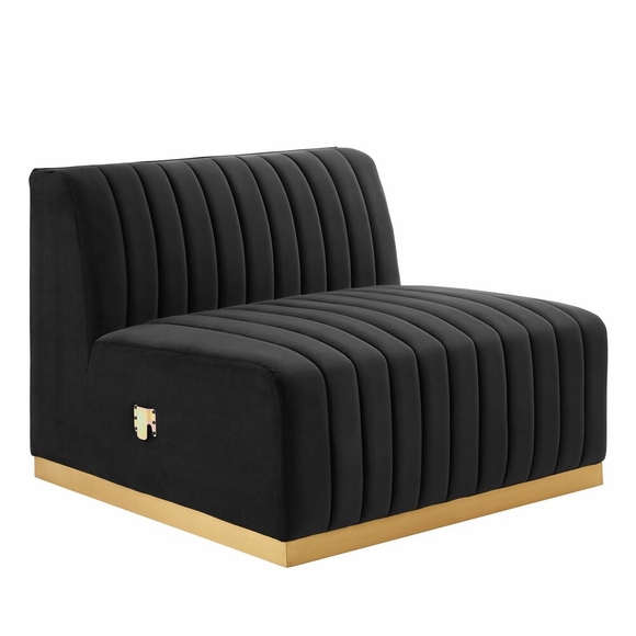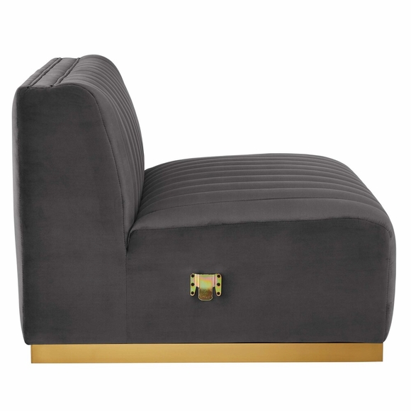 Modern appeal surrounds the Conjure Channel Tufted Performance Velvet Upholstered Armless Chair. Luxuriously soft, stain-resistant performance velvet upholstery covers dense foam padding and an individually wrapped spring coil system for a supportive living room chair that will become the go-to lounge spot for family and friends. Vertical channel tufting and subtle French piping adds depth to this vintage inspired sectional piece that effortlessly becomes the focal point in your living room. Solidly constructed from wood and plywood, this armless chair features non-marking foot caps and boasts a brushed gold stainless steel base. Versatile and elegant, this sectional sofa piece is ideally suited for a variety of decor styles in your living room, lounge, or home office. Chair Weight Capacity: 331 lbs.