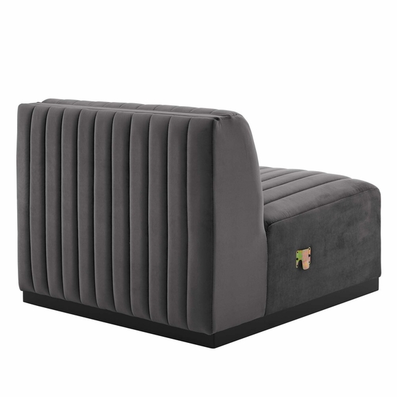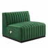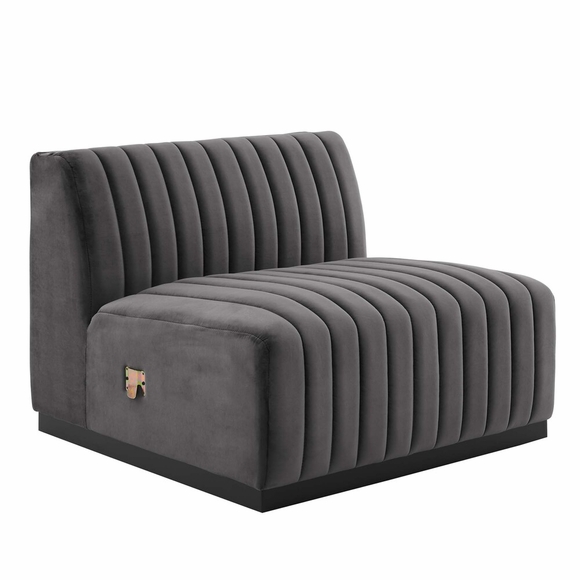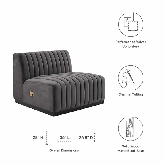Modern appeal surrounds the Conjure Channel Tufted Performance Velvet Upholstered Armless Chair. Luxuriously soft, stain-resistant performance velvet upholstery covers dense foam padding and an individually wrapped spring coil system for a supportive living room chair that will become the go-to lounge spot for family and friends. Vertical channel tufting and subtle French piping adds depth to this vintage inspired sectional piece that effortlessly becomes the focal point in your living room. Solidly constructed from wood and plywood, this chair features non-marking foot caps and boasts a matte black base. Versatile and elegant, this sectional sofa piece is ideally suited for a variety of decor styles in your living room, lounge, or home office. Chair Weight Capacity: 331 lbs.