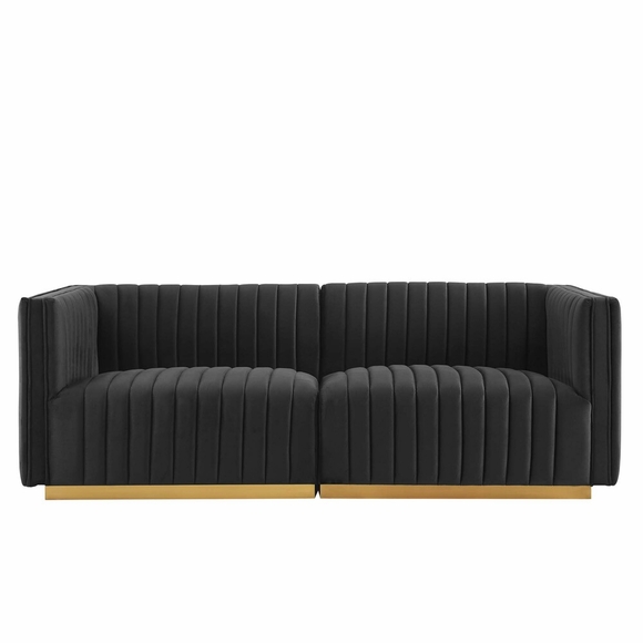 Modern appeal surrounds the Conjure Channel Tufted Performance Velvet Upholstered Loveseat. Luxuriously soft, stain-resistant performance velvet upholstery covers dense foam padding and an individually wrapped spring coil system for a supportive living room loveseat that will become the go-to lounge spot for family and friends. Vertical channel tufting and subtle French piping adds depth to this vintage inspired two-seater sofa that effortlessly becomes the focal point in your living room. Solidly constructed from wood and plywood, this loveseat features non-marking foot caps and boasts a brushed gold stainless steel base. Versatile and elegant, this sectional loveseat is ideally suited for a variety of decor styles in your living room, lounge, or home office. Each Seat Weight Capacity: 331 lbs.