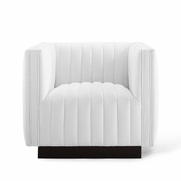 Follow the organic linear design of the Conjure Channel Tufted Fabric Upholstered Armchair. Relax into the glam deco style and allow the streamlined effect of the vertical channel tufting details to direct your living room decor. Conjure Armchair adds a charming retro modern style to your living room, lounge room, or home office. Individually wrapped spring coils are covered with dense foam padding and soft polyester fabric upholstery for a premium seating experience. This elegant living room accent chair rests securely on a matte black wooden base that complements any modern home or apartment. Armchair Weight Capacity: 441 lbs. Comes Fully Assembled.