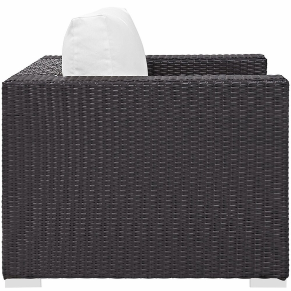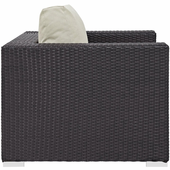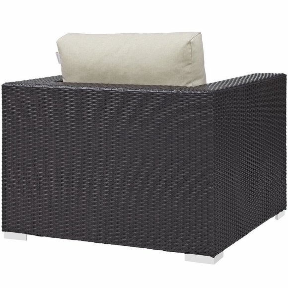 Gather stages of sensitivity with the Convene Outdoor Sectional series. Made with a synthetic rattan weave and a powder-coated aluminum frame, Convene is a versatile patio chair from an outdoor collection that shifts and combines according to the spontaneous needs of the moment. Outfitted with all-weather fabric cushions, Convene Outdoor Arm Chair leaves a positive impression on friends and family while enhancing your patio, backyard, or poolside repast in this series of palpable distinction. This installment of the series is an Outdoor Patio Arm Chair.