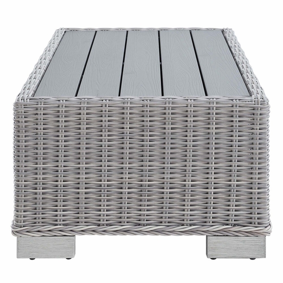Enjoy fresh air and alfresco relaxation with the Conway Outdoor Patio Wicker Rattan 5-Piece Furniture Set. Wrapped in UV-resistant light gray synthetic wicker rattan, this patio furniture set boasts organic texture and a neutral hue that brings a calming presence to your outdoor space. The frames of this outdoor furniture set are crafted with durable powder-coated aluminum and rest on L-shaped legs with plastic foot glides. Thick foam padded cushions covered with removable, all-weather polyester fabric covers offer a comfortable seat and affix securely to the lounge chair with cord tension attachments. Trending aesthetics and a classic design define this outdoor patio furniture collection making it a beautiful addition to any outdoor space including the backyard, patio, porch, balcony, or poolside. Assembly required. Set Includes: Sofa, Ottoman, 2 Armless Chairs, Coffee Table