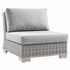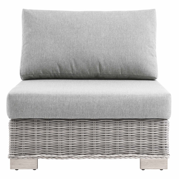 Enjoy fresh air and alfresco relaxation with the Conway Outdoor Patio Wicker Rattan Armless Chair. Wrapped in UV-resistant light gray synthetic wicker rattan, this patio chair boasts organic texture and a neutral hue that brings a calming presence to your outdoor space. The frame of this outdoor armless chair is crafted with durable powder-coated aluminum and rests on L-shaped legs with plastic foot glides. Thick foam padded cushions covered with removable, water-resistant polyester covers offer a comfortable seat and affix securely to the lounge chair with cord tension attachments. Trending aesthetics and a classic design define this outdoor patio furniture collection making it a beautiful addition to any outdoor space including the backyard, patio, porch, balcony, or poolside. Assembly required. Patio Armless Chair Weight Capacity: 300 lbs.