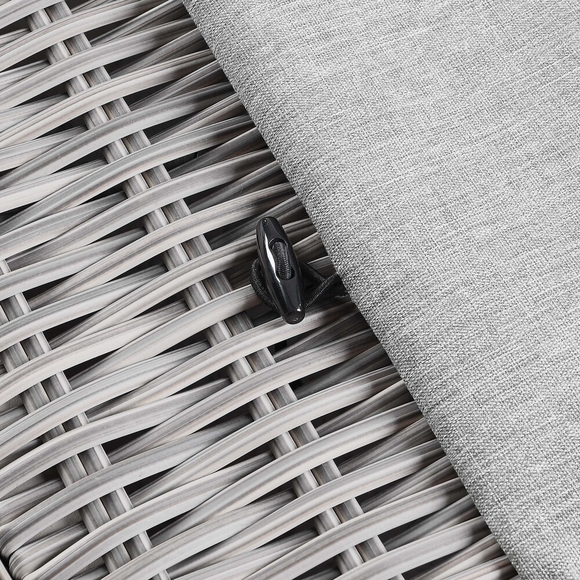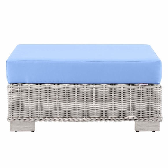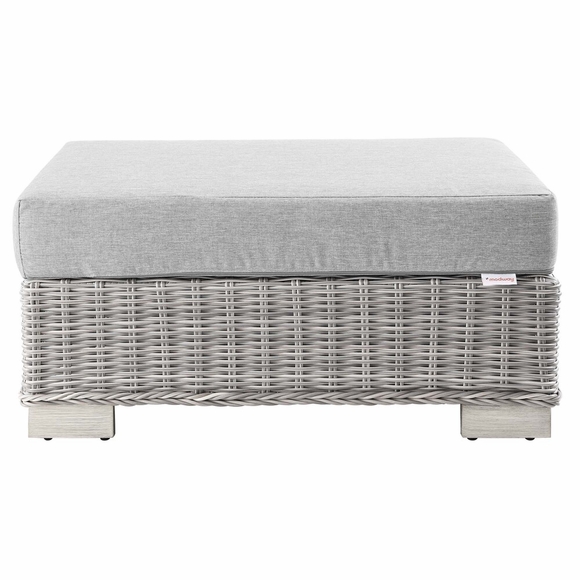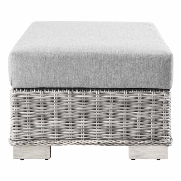 Enjoy fresh air and alfresco relaxation with the Conway Outdoor Patio Wicker Rattan Ottoman. Wrapped in UV-resistant light gray synthetic wicker rattan, this patio ottoman boasts organic texture and a neutral hue that brings a calming presence to your outdoor space. The frame of this outdoor ottoman is crafted with durable powder-coated aluminum and rests on L-shaped legs with plastic foot glides. A thick foam padded cushion covered with a removable, water-resistant polyester cover offers a comfortable seat and affixes securely to the ottoman with a cord tension attachment. Trending aesthetics and a classic design define this outdoor patio furniture collection making it a beautiful addition to any outdoor space including the backyard, patio, porch, balcony, or poolside. Assembly required. Patio Ottoman Weight Capacity: 300 lbs.