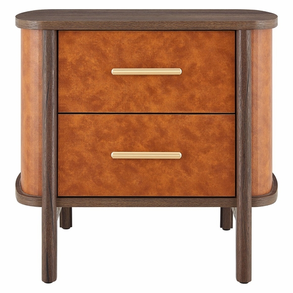 The Coralie Nightstand blends bold texture and refined form to create a striking modern accent for any bedroom or living space. Wrapped in smooth vegan leather with rich brown tones, this 2-drawer nightstand features a softly curved silhouette and wood grain drawers covered in vegan leather, for a vintage-inspired look. The generously sized drawers provide practical storage for bedside essentials, with gold-finished handles adding a sophisticated touch. Designed with stability and versatility in mind, Coralie works equally well as a nightstand, modern end table, or stylish side table for storage and organization. The floor glides on the legs of this bedside table help protect your floors and allow easy positioning. Assembly required.