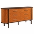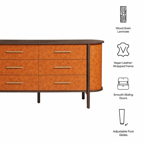 Bring vintage character and thoughtful design into your space with the Coralie Curved Dresser. Wrapped in vegan leather with wood grain laminate, this modern bedroom dresser has a warm, lived-in look that adds depth to any setting. The curved profile softens its edges, while the elongated oval shape feels both classic and fresh. Across the front, six drawers-each accented with a gold-tone handle-glide open to reveal spacious storage for clothing, accessories, or other bedroom essentials. Whether styled as a bedroom dresser, a sideboard cabinet, an office credenza, or even a storage chest in the living room, Coralie offers a mix of storage, surface space, and vintage charm in one thoughtful design. Equipped with adjustable non-marking foot glides to help keep it level while protecting your floors. Weight Capacity: 220 lbs.