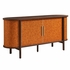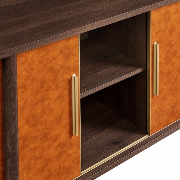 Bring vintage character and thoughtful design into your space with the Coralie Curved Sideboard. Wrapped in vegan leather with wood grain laminate, this modern storage cabinet has a warm, lived-in look that adds depth to any room. The curved profile softens its edges, while the elongated oval shape feels both classic and fresh. At the center, two tambour-style sliding doors-each accented with a gold-tone handle-glide smoothly apart to reveal four interior compartments, perfect for organizing dishes, linens, or anything that should stay close at hand but tucked away. Whether styled as a dining room buffet, an office credenza, a hallway cabinet, or even a TV stand for wall-mounted setups, Coralie offers a mix of storage, surface space, and vintage charm in one thoughtful design. Equipped with adjustable non-marking foot glides to help keep it level while protecting your floors. Weight Capacity: 220 lbs.
