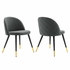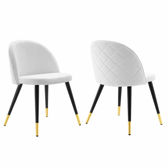 Inspire whimsical dining and stylish living with the Cordial Fabric Upholstered Dining Chairs - Set of 2. Featuring a rounded silhouette with French piping detail and a diamond lattice pattern along the back, these upholstered chairs are covered in soft polyester fabric and padded in dense foam to grant supportive comfort while dining or relaxing. A versatile addition to the dining room, kitchen, living room, home office, or entryway, these accent chairs rest atop black metal legs with gold accents and non-marking foot caps. Chair Weight Capacity: 300 lbs.