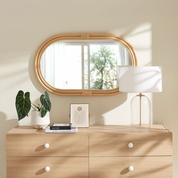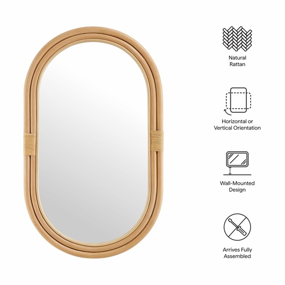 Bring natural warmth and timeless style to your space with the Corsica Oval Rattan Wall Mirror. Framed in smooth, thick rattan, this wall-mount oval mirror blends rustic charm with modern versatility. Its gently rounded shape and handwoven rattan details create a laid-back, boho-coastal feel perfect for a bathroom, bedroom, living room, or entryway. Designed to hang either horizontally or vertically, this rattan mirror adapts to your decor style-whether as a statement piece above a console or a vanity mirror. The reflective glass is surrounded by a sturdy rattan frame for durability and a warm, natural finish.