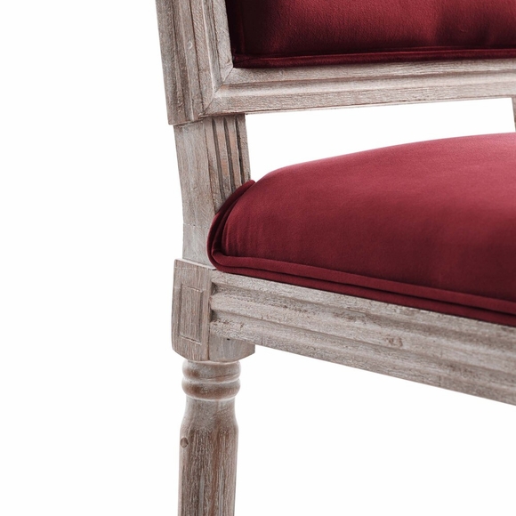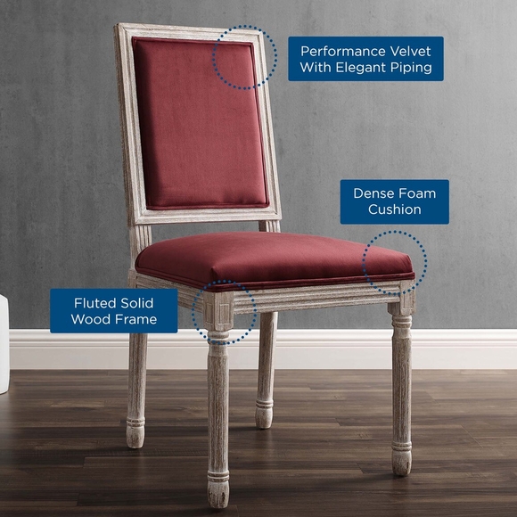 Revel in the whispered opulence of the Court Dining Side Chair. Featuring a fluted wood frame, dense foam upholstered performance velvet seat with elegant welting, this square back dining or accent chair harmoniously blends old world charm with modern intrigue. Designed with a vintage French look and an undeniable appeal, this velvet chair supports up to 331 pounds and comes with foot pads to preserve flooring. Comes fully assembled.