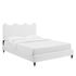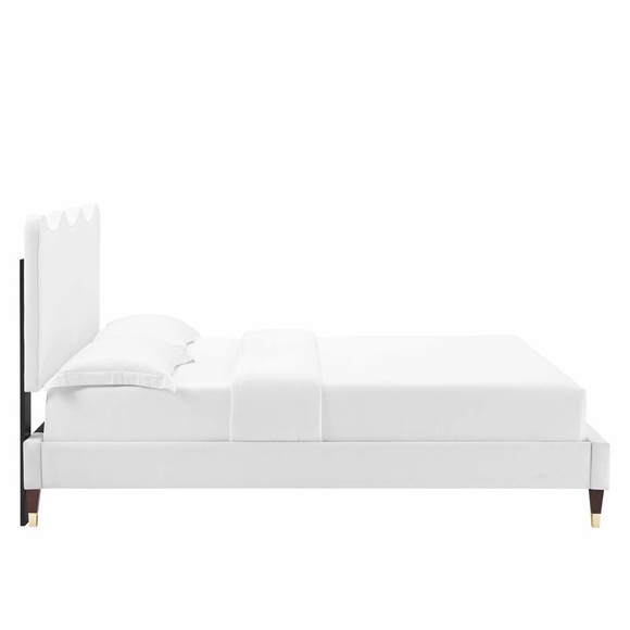 Bring the imagery of waves crashing against the shore to a teenager's bedroom or guest room with the Current Performance Velvet Full Platform Bed. Putting a modern twist on a classic scalloped design, the full headboard of this platform bed features luxe texture and a silhouette inspired by the ocean waves while dense padding offers a supportive place to sit back and relax while sitting up in bed. Covered in stain-resistant performance velvet, this upholstered bed frame is a sturdy mattress foundation for memory foam, innerspring, latex, and hybrid mattresses. Eliminating the need for a box spring, the MDF frame of this full bed is complete with a wood slat support system crafted with poplar for lasting durability and support. This slatted bed frame rests on wood legs with gold metal sleeves and non-marking foot caps and includes a reinforced center beam with two support legs for enhanced stability. Assembly required. Weight Capacity: 800 lbs.