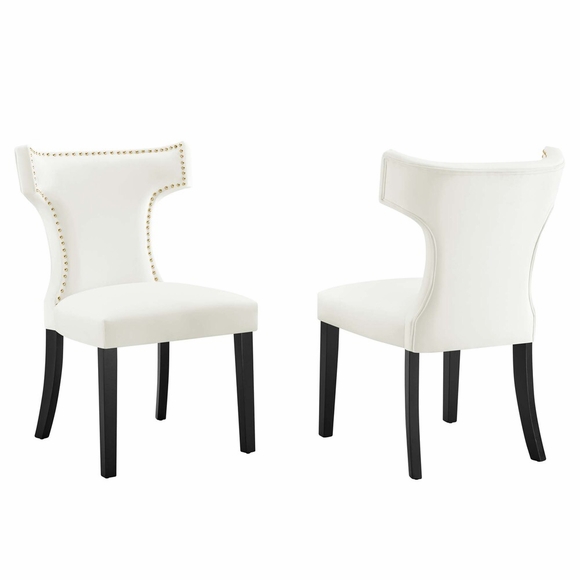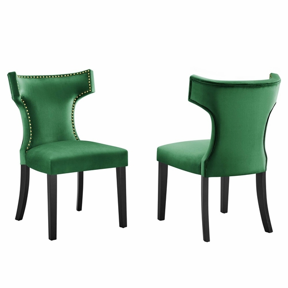 Transform your dining decor with the broadly designed Curve Performance Velvet Dining Side Chairs - Set of 2. Sweeping lines complement a minimalist shape for a chic look studded with nailhead trim. With a sinuous spring support system for a premium seating experience, Curve comes generously padded with dense foam covered in stain-resistant performance velvet, non-marking foot caps, and delivers just the right touch of finesse with tapered wood legs. Sporting an hourglass shape, Curve works well in a variety of dining room arrangements or as accent chairs in your office or living space.