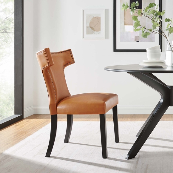 Transform your dining decor with the broadly designed Curve Dining Side Chair. Sweeping lines complement a minimalist shape for a chic look studded with nailhead trim. This dining chair comes generously padded with dense foam covered in vegan leather, non-marking foot caps, and delivers just the right touch of finesse with tapered wood legs. Webbing and zigzag springs create a support system that grants a premium seating experience and prevents sagging. Sporting an hourglass shape, this upholstered side chair works well in a variety of dining room arrangements.