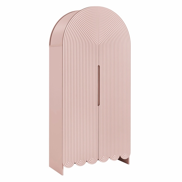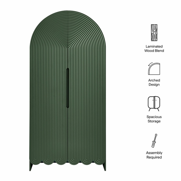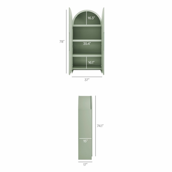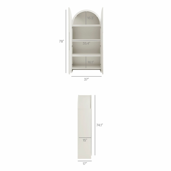Bring calm, sculptural storage into everyday spaces with the Dahlia 78 Inch Storage Cabinet. Designed as a tall, statement-making accent cabinet, Dahlia pairs a stylish arched top with softly fluted doors, mixing modern curves with subtle vintage details. The doors feature slim recessed handles that echo the curved front, while the scalloped detail along the base adds a playful finish. Inside, four roomy tiers offer flexible space for dishes, pantry items, linens, or decor, making this decorative storage cabinet a practical fit for living rooms, dining rooms, or hallways. Built from a laminated wood blend with soft-close hinges that keep the doors shutting quietly, the Dahlia Arched Cabinet is set on nylon floor glides to help protect floors and make repositioning easier. Assembly required. WEIGHT CAPACITY: Top Shelf : 110lb, 2nd Shelf : 110lb, 3rd Shelf : 110lb, Bottom Shelf : 110lb