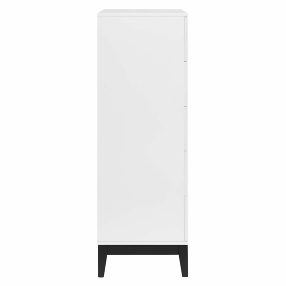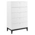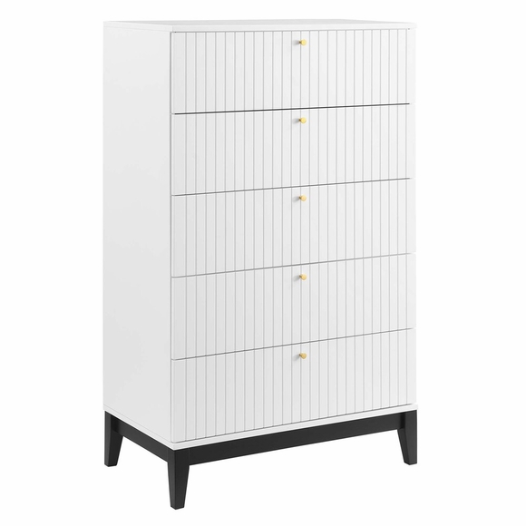 Restyle your bedroom decor with the Dakota Chest. Blending contemporary modern design with mid-century style, this chest of drawers is complete with a clean-lined design with panel detail and brass hardware. A centerpiece in any bedroom space, this chest features a durable rubberwood and painted MDF construction and rests atop a tapered frame with felt foot pads to protect flooring. Ample storage space in five full-extension drawers keeps visual space clean and clothes, accessories, and more neat and organized.