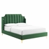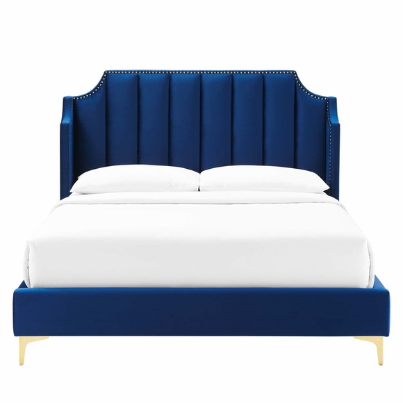 Inspire tasteful elegance and vintage modernity in a master bedroom or guest bedroom with the Daniella Performance Velvet Queen Platform Bed. This tufted bed brings a glam deco presence to your bedroom with its channel tufting, nailhead trim, and unique wingback design. The padded queen headboard and side rails come covered in soft, stain-resistant performance velvet upholstery that grants rich texture to the luxurious design and a supportive place to rest while sitting up and relaxing in bed. Resting atop gold metal legs, this platform bed frame, crafted with MDF, plywood, and LVL, is a sturdy mattress foundation for memory foam, innerspring, latex, and hybrid mattresses. with supporting legs and a reinforced center beam, this upholstered bed is complete with a poplar wood slat support system that offers lasting stability and healthy air circulation. Assembly required. Queen Bed Weight Capacity: 800 lbs.