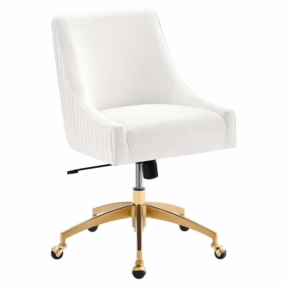 Gently sloping arms cascade down from the flowing design of the Discern Performance Velvet Office Chair. Solidly constructed from wood and plywood, Discern comes with dense foam padding upholstered in stain-resistant performance velvet. Complete with a gold stainless steel base with five hooded single ball casters, matching decorative handle, and pleating on the back of the chair, Discern is a soft and durable addition to your office setting. Create a cozy, customizable seating experience with this stylish office chair featuring pneumatic height-adjustment, 360° swivel, and tilt tension control. Assembly required. Weight Capacity: 331 lbs.