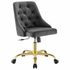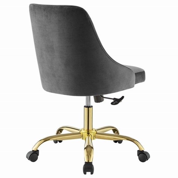 Introduce glam deco style and vintage modern elegance to your home office with the Distinct Tufted Performance Velvet Office Chair. Featuring gold metal accents and beautiful button tufting, this desk chair is padded in dense foam and upholstered in soft, stain-resistant performance velvet offering a supportive, comfortable place to sit during the workday. A chrome gold base and five dual-wheeled nylon casters provide easy movement over hardwood or carpeted surfaces while the full 360-degree swivel, tilt tension control, and pneumatic height adjustment create a custom seating experience. Perfect for the modern home or office, this office chair is a desirable addition to any workspace. Chair Weight Capacity: 220 lbs.